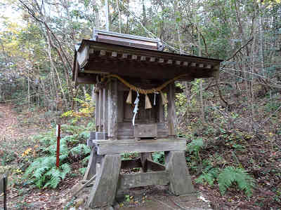 下山方向は左だがそのまま北へ進むと大岩の展望地があり、一旦進み掛けたが時刻は既に14時前。大師山へ周回を予定しているため、この方向へ向かうのは次回とする。坂を下れば頂上まで300mの案内を通過、すぐに白滝城・白滝水神社・鏡池への分岐に着いた。白滝水神社へ参拝、背後の鏡池に水は無かったが、神社周囲には結界の縄が張られ、神社の注連縄は新しくなっていた。