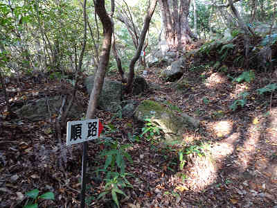 これから先のくぐり岩へは久しぶりに歩くことになる。真砂の道をわずかに下り左右にシダを見ながら南へ向かって水平道を進む。眼下には樹間越しながら奇岩大岩が一望である。