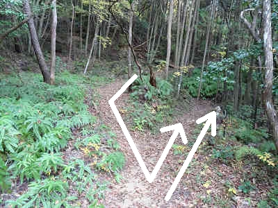 頭上に広がる紅葉を眺めていたらシダの横に立てられた「頂上まで700m」の案内を過ごし、わずかに高度を上げれば左(北)に向かって折り返し尾根へ着いた。尾根の起点には頂上方向と案内があり、道に迷う心配はない。この地点で頂上まで660m、多くの案内に安心して登ることができる。