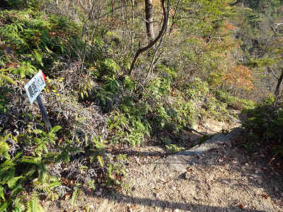 この先で水量の少ない滝に出会うが、落葉の時期なので以前の美しい滝とは別のもののように感じた。頂上まで900mの案内を通過、この先からは足下のえぐられたような道を進む。