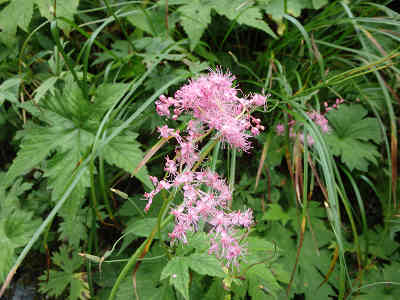トリカブトの花 途中の水場と登山道の風景 シモツケソウやイチゲなどの花、つぼみのリンドウなどを観賞し小石混じりの坂を登る。やがて坂の傾斜が緩み、草原が土石流により流されて裸地になったようなピークへ着く。更にこの奥へ進むと左右は自然林に覆われ、わずかに下ると水芭蕉の多い「3.小日向」のポイントへ着いた。猿倉荘からは2時間15分の行程である。