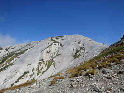 背後を振り返れば霧は雲に変わり、雲が南から北へ向かっているのが見えている。少しでも早く稜線へ立たなければ展望が無くなりそうな予感に駆られ、少し急ぎ足となる。白い砂利道に入り、小刻みなジグザグを描きながら高度を上げていると、鑓ヶ岳へ続く稜線手前には大岩がそびえている。この岩は青空に映えてとても美しい。 やがて主稜線の分岐へ到着、この分岐を左に採れば天狗尾根、右に採れば白馬鑓ヶ岳方面となる。ここでは鑓ヶ岳を目指して分岐を右折。ところが、稜線を吹く風がとても冷たく、軍手では手がかじかんでしまうので防水手袋へ変更。また、半袖では凍えそうなので、この上に服をはおり出発した。鑓ヶ岳を眺めると、山頂付近に白い標識が立っているようだ。