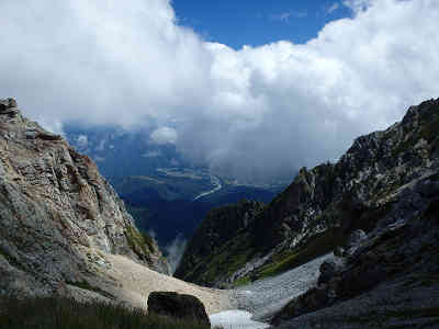 それにしても右側の長野県側の切れ落ちた断崖は感動ものであり、その先には市街地が雲の切れ間から見え始めた。進行方向の杓子岳の先には白馬岳が顔を出し、その下には本日宿泊予定の白馬山荘が見えている。目的地が見えたことにより少し元気になり、杓子岳へ向かう坂にとりかかる。