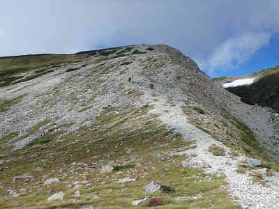 午前7時過ぎに鑓温泉小屋を出発、前方に見えてきたのはとんがった山で、青空の中に浮かび上がっているように見える。その下には白い雪渓、周囲には緑の草原が広がり、この景色だけでも感動の美しさ。昨日より見慣れているトリカブトの花を眺め、足下に岩の多い道を進む。