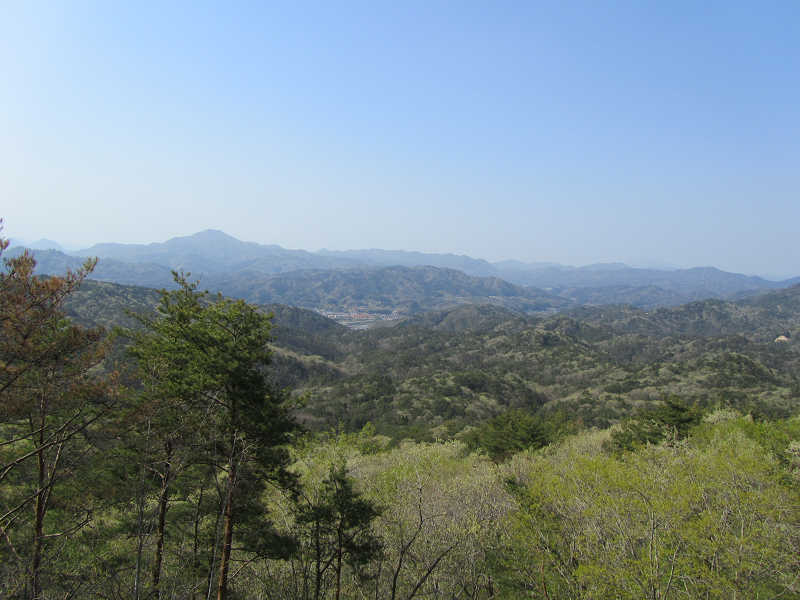 弥山山頂 少しの間階段を踏ん張ると、展望広がる弥山の山頂に到着。ああ、これは素晴らしい。北東に原山、右に二つ山、北に石見冠山、北東には霞みながらも三瓶山。西には阿佐山、丸瀬山も見えている。昨日までの黄砂が少し取れ、空も少し青く見えている。周囲360度とはいえないが、それに近いくらいの展望が広がっている。