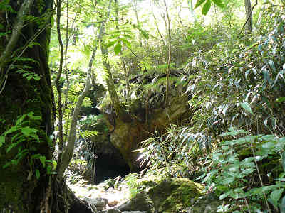 スズタケの道を折り返しながら高度を稼ぐと10分で天狗の水場に到着、これはありがたい。空になったペットボトルに1リットルの水を補給、冷たい天狗様の水を頂くと身も心も生き返る。水場を過ごすとすぐに大きな天狗の岩屋に着く。この岩屋では宿泊することも出来るそうだ。天狗の岩屋を過ごすと5分で1500m標識、この間の100mは20分で通過。
