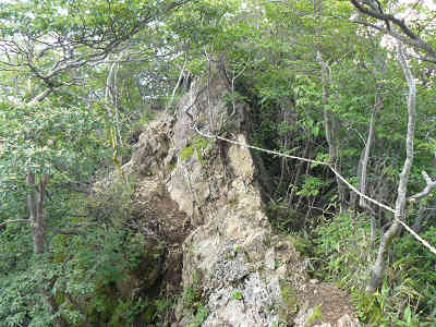 渓谷の中を沢沿いに進み、再び木漏れ日の下を進めば標高700m標識、標高差100mはウオーミングアップ代わりに約35分で通過。すぐに川上渓谷と祖母山登山道の分岐を見る。登山道は木の根の張り出す急登となり、ロープの垂らされた斜面に取り付く。周囲に展望はなく、木の間越しにようやく岩峰を見ることが出来た。