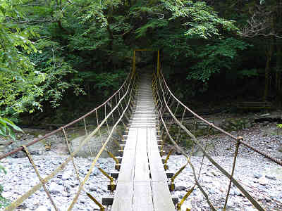 奥岳川源流の碑を過ごし奥谷渓谷を右手に見ながら進むと、古く朽ちたコンクリート製階段が現れる。「祖母傾山系の自然」の標識を左手に見て木漏れ日の下を進めば奥岳川に架かる立派な吊り橋に着く。この吊り橋はゆらゆらしてとても懐かしい吊り橋、眼下の清流は美しく、橋の上には適度な風が吹いており、汗がすーと引いてゆく。