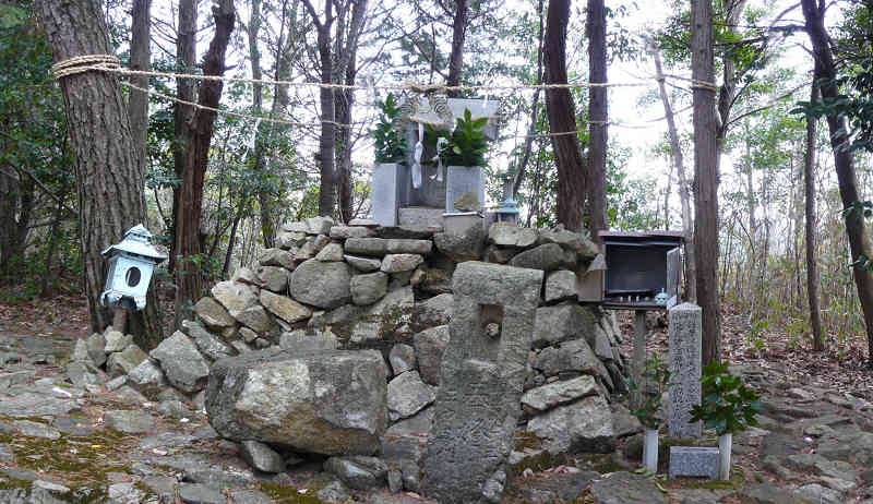 鉄塔下から北へ続く細い坂道を進むと、植林帯の道はとても明確である。やがて足下に石段が始まり、その先に石城山山頂のシンボル、見事な石積みの上に祀られた石鎚日動大権現社の石祠が現れた。新しい年に新しいしめ縄の渡された社に参拝、とてもすがすがしい気持ちになる。