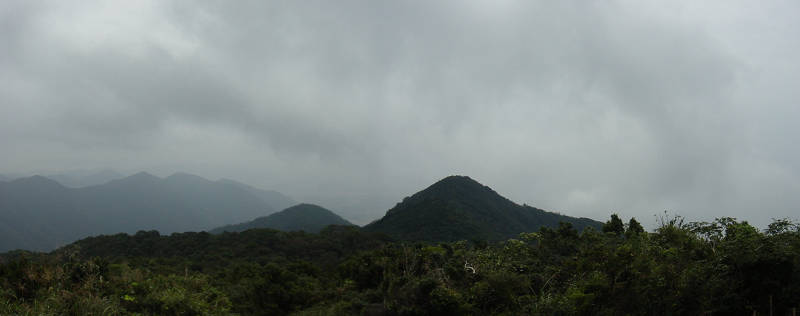 竜王山から北方面の展望 深坂ため池コースとは様相は一変し、本当の?山道を下ることになる。すぐに吉見垰経由の鬼ヶ城への分岐に出会うが前回通ったことがあるので分岐を間違えずに左の吉見コースを取る。ここからは急な滑る道が続くが、階段が無いために滑らないように木の枝につかまりながらゆっくりと降りて行く。この作業はなかなか重労働で、足にも腕にも負荷が掛かる。