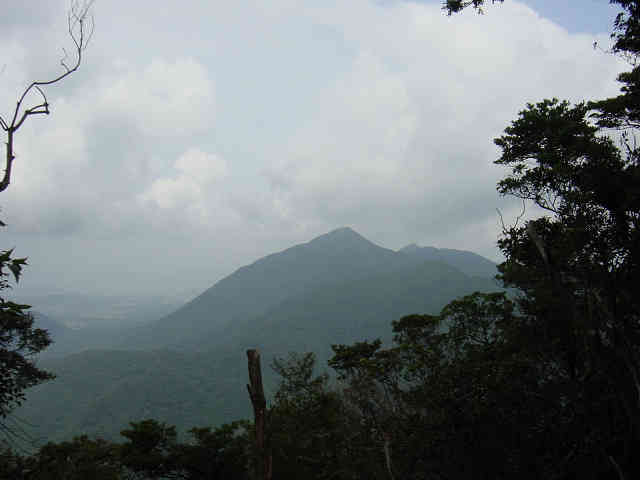 風に元気を貰って再出発、ここからは階段道はジクザグ道となり、ゆっくりゆっくりと高度を稼いでゆく。ベンチから15分程度で初めて木の間越しに南方面の展望が開けた。霞が掛かっているので大展望とは言えないが、晴れていれば疲れが吹き飛ぶような展望が広がっている。しばらく展望を眺めて元気を回復する。目の前には天に続くような素晴らしい階段が立ちふさがっている。一歩一歩階段を踏みしめて高度を上げて行くと登山開始から1時間13分で牝鋤先山四等三角点に到着した。