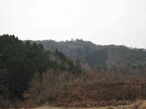 山頂に反射板の立つ炭倉山を振り返る 農家の方にお礼を述べて登山口まで戻り、お地蔵様にお参りして登山を終了した。莇地集落を出発し、国道に戻っていると背後に炭倉山の反射板が見えた。山頂に立つ事により、その山の特徴を覚え、麓から登った山を確認できることがとても嬉しい。