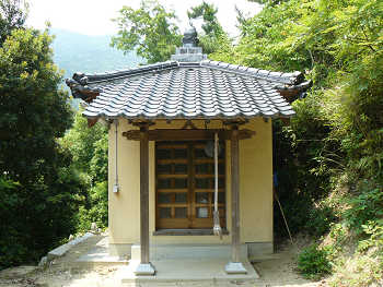 奥の院に参拝し、県道を西に向かう。左に広がる青い海が美しく、西の海には法師崎と法師岩、上荷内島が霞んでいる。もう少し進めば目の前には家房の集落が現れた。東家房のバス停を過ごした先で、大島看護学校へ向かって右折、次の分岐を左折すれば右手に第8番札所の奥の院が見えたので立ち寄る。