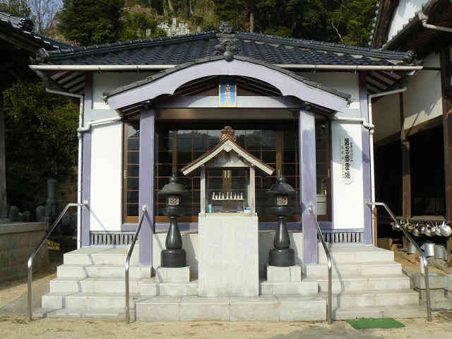 T字路に着くので左折し、左手に注意しながら進むと丘の中腹にお堂が見えてくる。もう少し進むと小さな案内板があるので左折、細い道を進む。少しの石段を登れば第73番札所地蔵堂に到着。