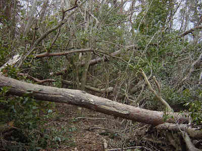 植林帯の先には展望地が広がっていた 道を引き返していると先ほど見た緑山の道標があったので尾根方面に行くと尾根道があるかもしれないと思い、道無き道を行くと尾根にちゃんと尾根道があった。この道を行くとまたまた中電鉄塔に着いた。この鉄塔は道徳山と先ほどの登山道との中間点の鉄塔だった。この尾根道を戻れば緑山だと決めつけて駆け足で戻った。すると道は登山道に合流し、分岐点からすぐに倒木があり、道がふさがれていたので気がつかなかっただけであった。倒木はこのように視界を遮ることもある。