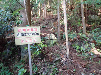 植生に竹の混じる場所を過ごし、進路がわずかに右へ向く起点に山頂まで1400mの案内があり、この横に炭焼き窯跡を見る。少しずつ坂の傾斜が増し、間もなく山腹につけられた道を進む。この先で折り返せば中間点を通過、山頂までは1000mである。