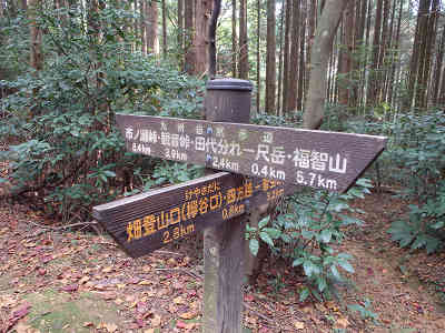更に沢沿いを進み、少し高度を上げると岩に文字の刻まれた石柱を過ごす。少し平坦な道を辿れば、左には樹間越しに送電鉄塔が見えてきた。この鉄塔下に行き展望を確認するが、樹林に覆われて展望を得ることはできなかった。更に山腹につけられた道を進むと、間もなく福智山へ続く縦走路へ飛び出た。右方向は尺岳方面で、左側は二方向に分岐する。