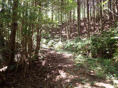 やがて大きな堀切状態の場所を通過、この付近にはカヤが多いので身体に傷を作らないよう注意して通過した。この先で更にカヤがきつくなり、カヤをなんとか通過すると基幹林道小野線に着いた。