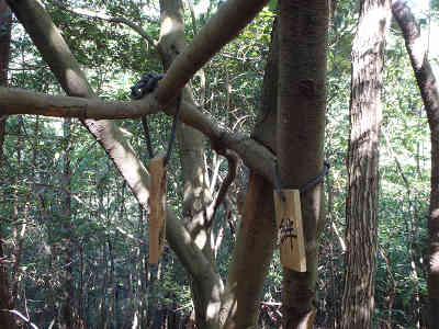 五丁の展望所から眺める風景 やがて五丁へ着けば、少し大きめの大日如来が置かれていた。木漏れ日差す自然林の下を進み、六丁休堂跡を通過。案内によれば、今歩いている道は近畿自然歩道とのことである。少し進むと樫の木綱(かしのきづな)の案内があり、珍百景候補?と書かれてた。いったい何かと思って見ると、2本の木がくっついていることが珍しいと言うことだ。 すぐに七丁、八丁を通過、巻き道もあるがここでは直登道を採り、岩の露出した道を一気に駆け上がる。背後を振り返れば、展望も一気に広がり、青空の下に広がる風景が美しい。左に「愛心」と書かれた岩を過ごせば間もなく十一丁へ到着、ここには砥石坂の案内が置かれている。