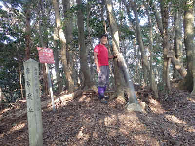 間もなく平坦な尾根へ着き、わずかに進むと白馬山の山頂へ到着した。樹林の中の山頂には岸取城跡と白馬山山頂261mの標柱が立っていた。山頂から周囲を眺めるが、木々の背が高く全く展望はない。