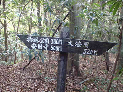 三光園の下から安国寺へ向かうことのできる近道を探していると、梅林公園の案内を見つけた。樹林の中につけられた赤いテープを頼りに進むのだが、古い遊歩道らしく、擬木の階段を探すのにも苦労するほどだ。樹林の中で梅林公園への案内を見つけたが、この先からは荒れた道に変わり、大きく迂回しながら目印のテープを探す作業が必要となる。