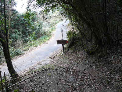 南の広場を出発、いよいよ大島半島縦走に入る。整備された階段を下れば途中でベンチの置かれた休憩所を過ごす。フカフカな落ち葉の絨毯を踏みしめ、坂を下れば、南の広場から5分で車道と出会う。車道を横切り、更に坂を下ればこの先で再び車道に出会う。車道を少し進み、日本テレコムの太華山無線中継所の地点から左の道に入る。