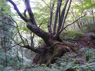 よし!、行こう。中国百名山最後の山はこの鯛ノ巣山。「熊の生息地域!」の警告にクマ除けを装備、急いで登山口を出発する。 緩やかな傾斜の登山道を少し進むと大きな岩が見えてきた。この山には岩が多い印象を受ける。また、周囲には自然林が美しく、緑のシャワーがとても新鮮で嬉しくなる。大岩の間を抜ければ竹流水の案内を見る。この流れは細いようだ。竹流水の先にイザナミ(鯛ノ巣)国有林の案内板を通過、苔むした岩を眺めながら細い道を進む。杉の植林帯の下を進めば三合目、鯛流水に着く。ここの流れも細いようだ。