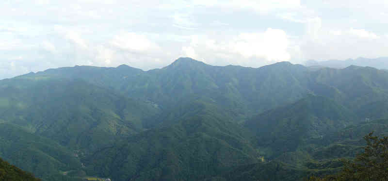 猿政山 笹の刈られた登山道はとても歩きやすく、もう少し下り、樹林の下を進めば大きな岩が現れた。岩の上に立ち、南西方面を眺めると、今度は何も遮るもののない猿政山と毛無山の展望が広がる。素晴らしい岩の展望地に立ち、しばらく猿政山方面を眺める。何時まで見ていても見飽きない猿政山、この山は登っても眺めても素晴らしい山であることを実感。猿政山へもう一度登ってみたくなった。そう言えば、猿政山から眺めた鯛ノ巣山も素晴らしい山容だった。ひとつ一つの山に素晴らしい思い出があり、積み重なっての中国百名山。いよいよ最後の山から下山を開始する。
