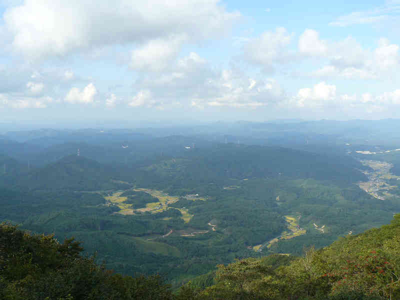 100番目の山頂 落ち着いて眼下に広がる展望を確認していると、懐かしい岩伏山、亀嵩の玉峰山、携帯基地局のアンテナが立つ伊賀平山、その奥には大山、少し霞んだ展望ながら充分満足出来る展望が広がっている。