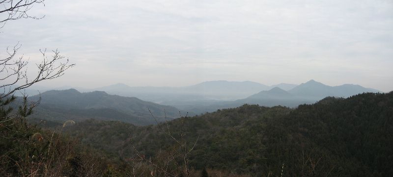 南の展望 深山、琴石山、田尻行者山、皇座山、大星山、多賀山と続く 正面には深山が聳え、深山の先の南東方面には琴石山、手前には田尻行者山三山、その右手には皇座山・大星山、その稜線の先には小行司の多賀山が見える。周辺の山々が一望の展望地にてしばらく休憩を取る。双眼鏡にて蓮華山から多賀山までをじっくり観察した後、ようやく下山を開始する。シダの道を迷わないように慎重に降りて行き、峠に到着した。