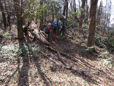 少々踏み跡は薄いが、急な坂に取り付き、少しずつ高度を稼ぐ。ここでは林道歩きはないので、林道に出ない方が順路である。さて、斜面につけられた道を辿り、やがて尾根へ出れば明確な道となる。