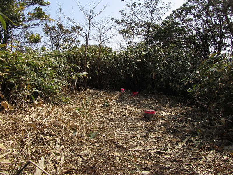 高羽ヶ岳の山頂風景 周囲の木々の背が高く、見えているのは761m標高点ピークくらいだが、空は青く気持ち良い。ここでのんびり昼食タイム、暫し歓談の後、山頂を出発する。南西へ向けて笹の道を下れば再び自然林の下へ。