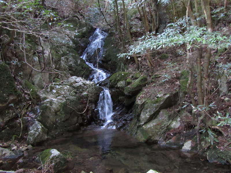 やがて沢沿いに下り始めると、周囲に石組みの跡を見つけることができる。周辺に生活の跡を見つけながら谷を下り、やがて小滝の前に着く。ここで進路は南へ変わり、沢沿いを下る。