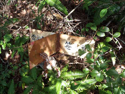 わずかに高度を上げれば448mの標高点へ到着、樹間越しに高羽山を眺めて南へ続く道に入る。この付近から下山に備えて最低限のテープを巻いて進むことにした。植林帯の下を進み、時折国有林の表示のある石杭を過ごす。間もなく目印のテープが進行方向に続き始めた。これで少し緊張感が取れ、目印にしたがって南へ進む。