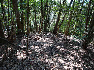 鉄塔の右上へ続く登山道に入り、巡視路と別れて西へ進む。足下には倒木などが目立つので障害物を迂回しながら進むと、急に坂の傾斜が増す。この坂は真っ直ぐ進むと傾斜がきついので左側へ迂回しながら高度を上げる。