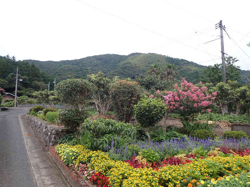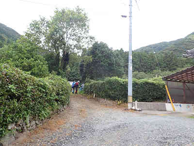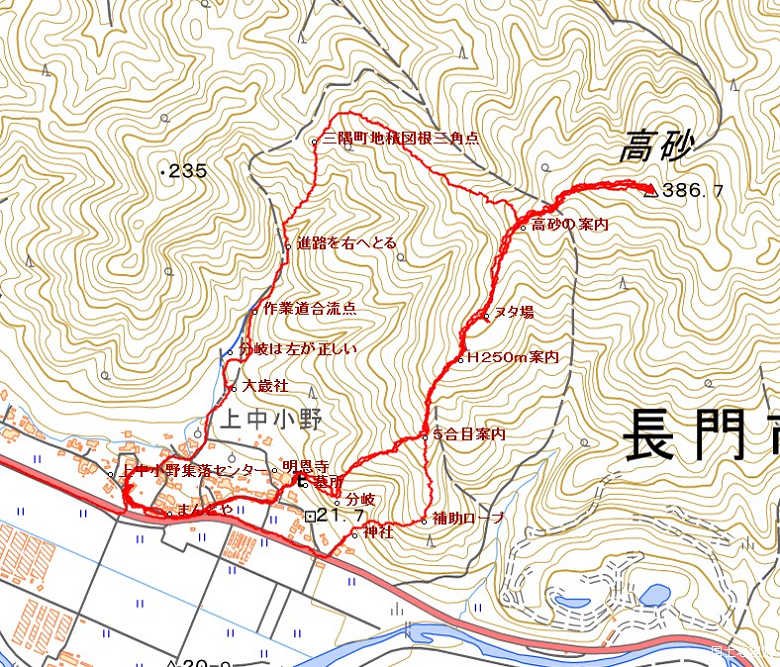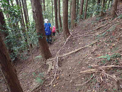 途中で目印と思われるテープを確認、そのまま下っていると補助のトラロープまで置かれていた。更に下っていると最後に竹林が我々の行く手を阻んだ。そこで歩きやすい場所を選びながら障害物競走のように竹を避けて下ると、鳥居のある神社へ降り立ち、神社から石段を下り、国道191号を西へ進み、登山口の上中小野集落センターまで引き返した。