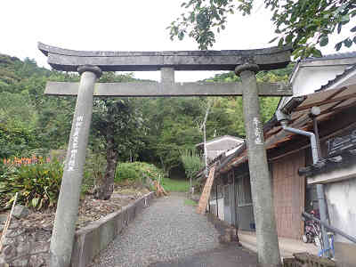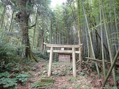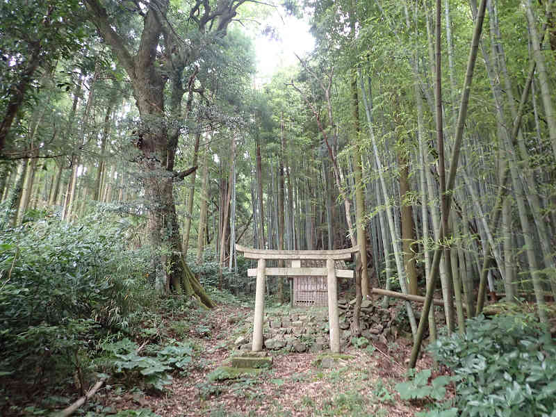 道なりに舗装道を進み、最後の民家を過ごせば未舗装道に入る。入口の電柱には、「ミスミ188左6」と「小野26」の表示がある。奥へ進むと進行方向に鳥居が見えたので参拝、大歳社の左側には立派な御神木がそびえていた。