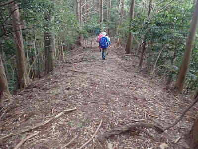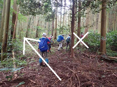大歳社入口まで戻り分岐を左へ進む。すぐに植林帯に着き、我々は分岐を右にとったが、この分岐は左が正しい。植林帯からトラバース気味に北へ向かったが、やがて先程の分岐から続く作業道に合流した。