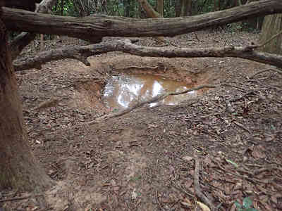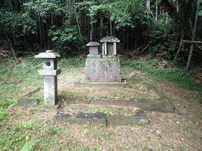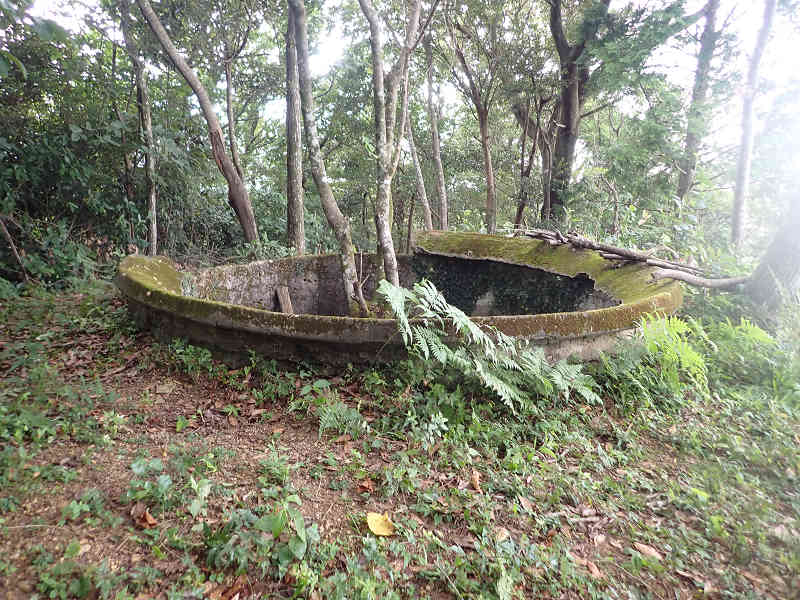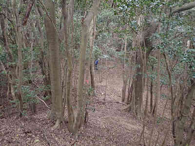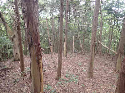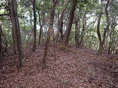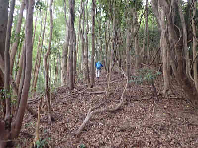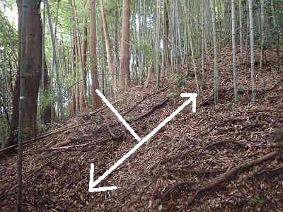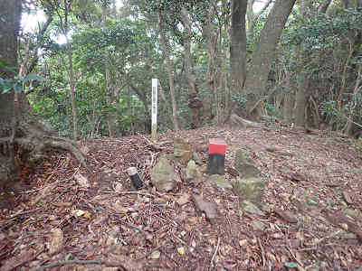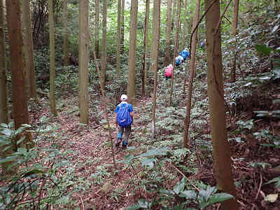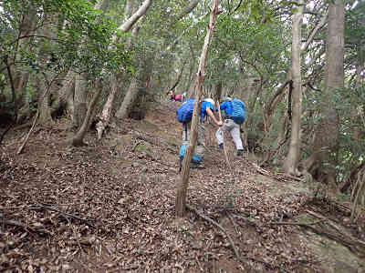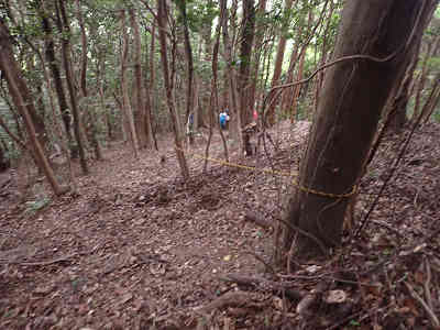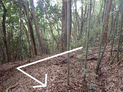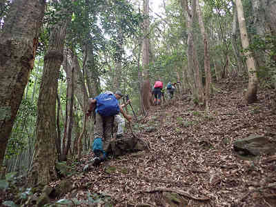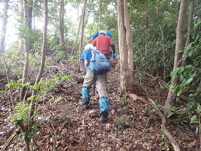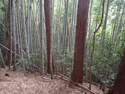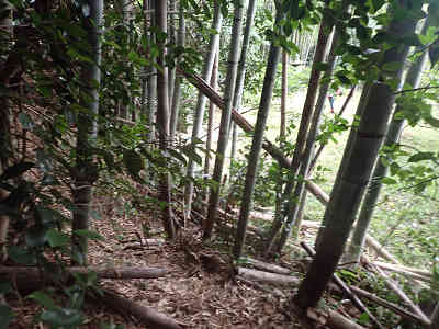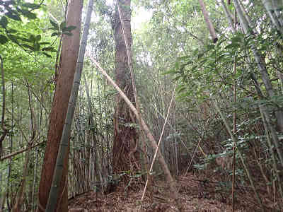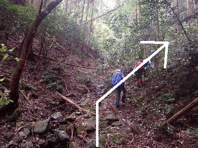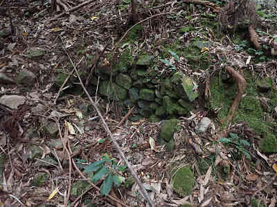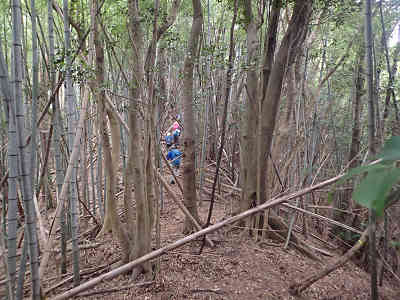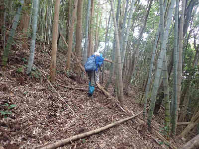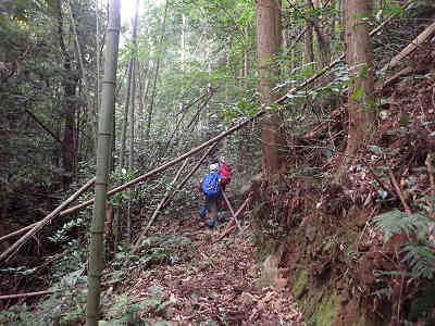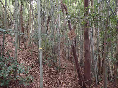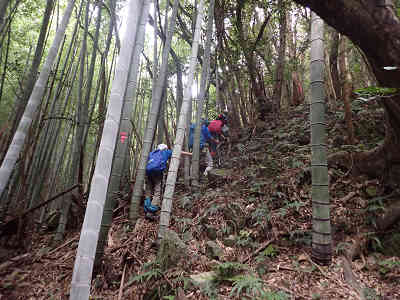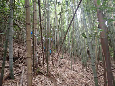 荒れ加減の作業道を進んでいると、途中で石垣の一部を見つけた。この辺に生活の跡が残っていた。谷に沿って少しずつ高度を上げていると左の木にテープ巻いてあった。進行方向を確認すると、右上に目印が続いていた。そこで進路を右にとり、左側に竹林を眺めながら急登へ向かう。