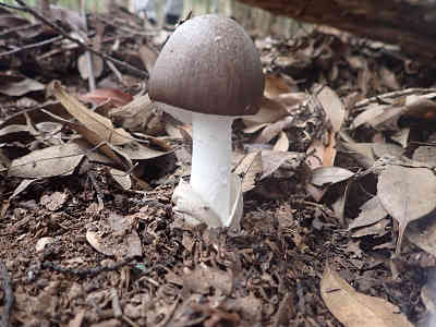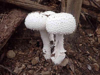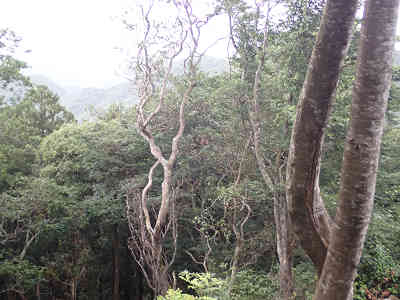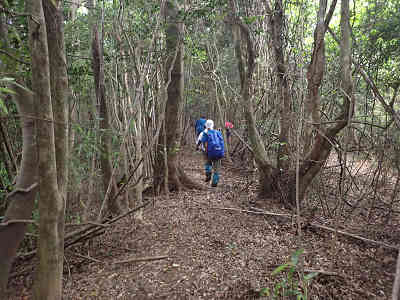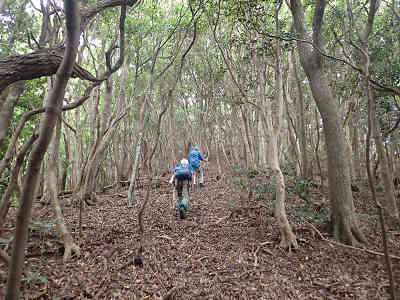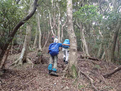 小休止の後、わずかに下って登り返す。鹿に根元を食べられたような木々を過ごし、次に自然林の中に竹林が混じった植生を眺めながら進む。この途中で立派な形をした毒キノコとシロオニタケを見つけた。