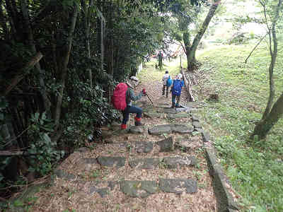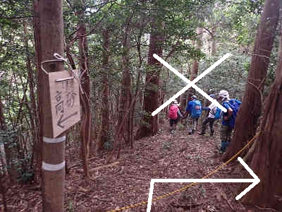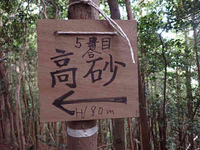 この先も急登なのでゆっくり高度を稼いでいると、やがて登山道の傾斜が緩やかになり、周囲に竹が増えてくれば、突然という感じで明恩寺から続く登山道に合流した。少し上には手製の「高砂」の案内があり、これは前回3月の登山時に見た記憶がある。