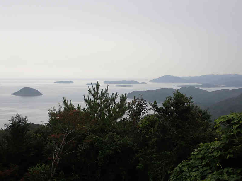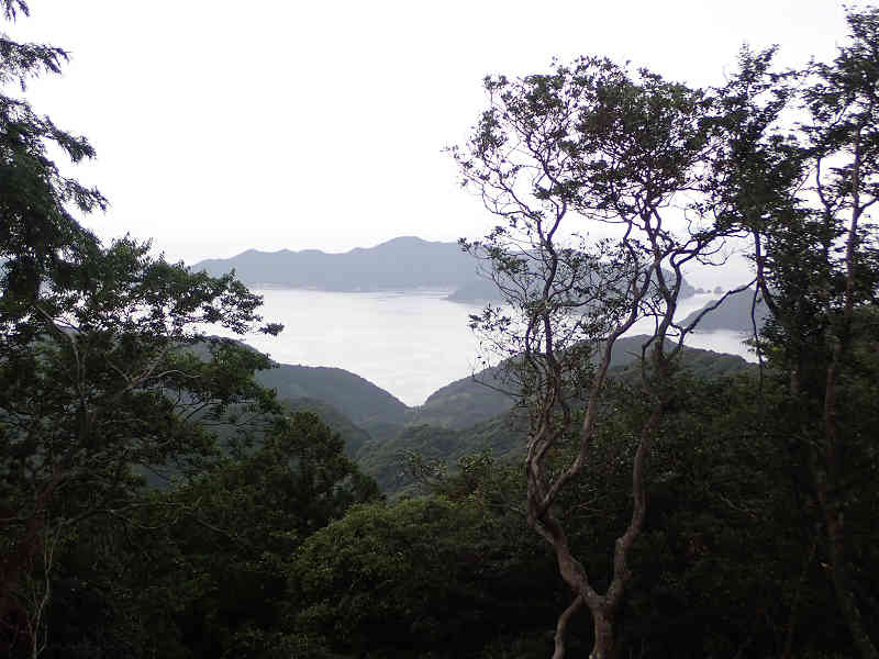 ツルの巻き付いた木を過ごし、周囲に竹の多い登山道を辿れば、突然前方が開けて高砂の山頂に着いた。ぼつりぼつり雨の降る山頂だが、萩方面の展望は前回の晴れたときよりも優れていた。