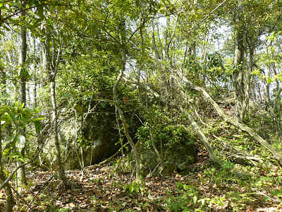 周囲に大岩を眺めながら進むと、まるで亀のような岩を過ごす。このあたりでは木の間越しながら、南にアンテナ群を眺める。この山脈は枕木山から澄水山へ続くものである。間もなく267mピークを通過、ピークから進路をわずかに左に振り、すぐに下り始める。