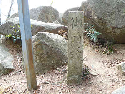 馬返しの説明板と石碑 周囲の展望を眺めた後、馬返しを出発し、更に山頂に向かって登って行く。標識によると次は御門跡で馬返しからは258mの距離である。分岐を通り過ぎ、滑りやすい道を進むと、岩の転がる斜面に着き、この岩を越えると展望の開けた御門跡に到着した。御門跡の説明板は薄くなっているが何とか読むことが出来た。