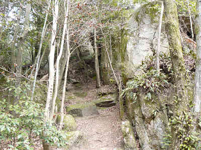 大きな岩の間を抜けて進む 大岩の間を進んで行くと頂上と弓場跡の分岐に到着、武田山の頂上に向かって進む。更にその先にも武田山と火山の分岐を見るので武田山に向かって右道を取る。岩の道を少し進むともうそこは展望の武田山山頂である。