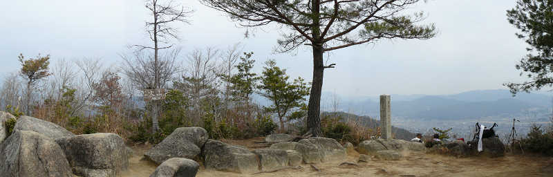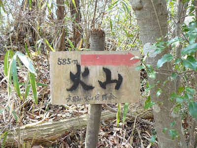 シダの道を越え、白い馬酔木の花を鑑賞しながら進んでいると、もう山頂は近い。前方が明るくなると同時にすぐに三角点の立つ火山の山頂に到着した。火山の山頂は岩の点在する広い場所で神武天皇烽火伝説地と彫られた石碑が立ち、火山の山頂からは東から南方面、北から西方面の展望が広がっている。