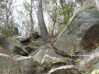 間もなく平坦な広い場所に着いたかと思ったら、城跡(千畳敷)に到着した。城跡にも説明板が立っているのだがこの説明板は朽ちており読み取ることが出来なかった。標識によると頂上まで143m、広い千畳敷きを後にして更に山頂を目指して進んで行くと、岩の間を登って行くことになり、その先には更に大きな岩が待っていた。