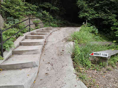 駐車場に車を置いて小さなリュックにペットボトル2本を入れてまず焼火神社へ向かう。15年前焼火神社へ向かう道は板で作られていたが、今回は左半分がコンクリート階段、右半分がコンクリート鋪装に変わっており、木製だった手摺りは金属製に変わっていた。