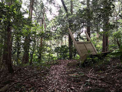 更に奥へ進むと西ノ島DTV中継放送所の施設が建っていた。三角点付近からの展望は周囲の樹林の背が高く、望むことはできなかった。これは前回登山時と同様である。中ノ島の金光寺山で見かけた山頂標識と同じ字体の標識がこの焼火山にも置かれていた。三角点横に置かれたベンチに腰掛けること無く山頂を出発、探索の道の先に設置された展望地へ向かうことにした。