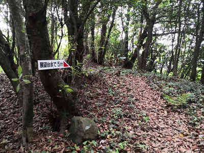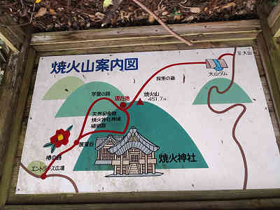 焼火神社を出発し、社務所前から知夫里島のアカハゲ山を眺め、立派な石垣に沿って引き返す。石垣を過ごし少し進んだところから右側を眺めると擬木階段と案内が置かれていることに気づく。この階段が焼火山へ続く道であり、金属製の鳥居の建つ場所から山頂へ続く道の途中で合流する。